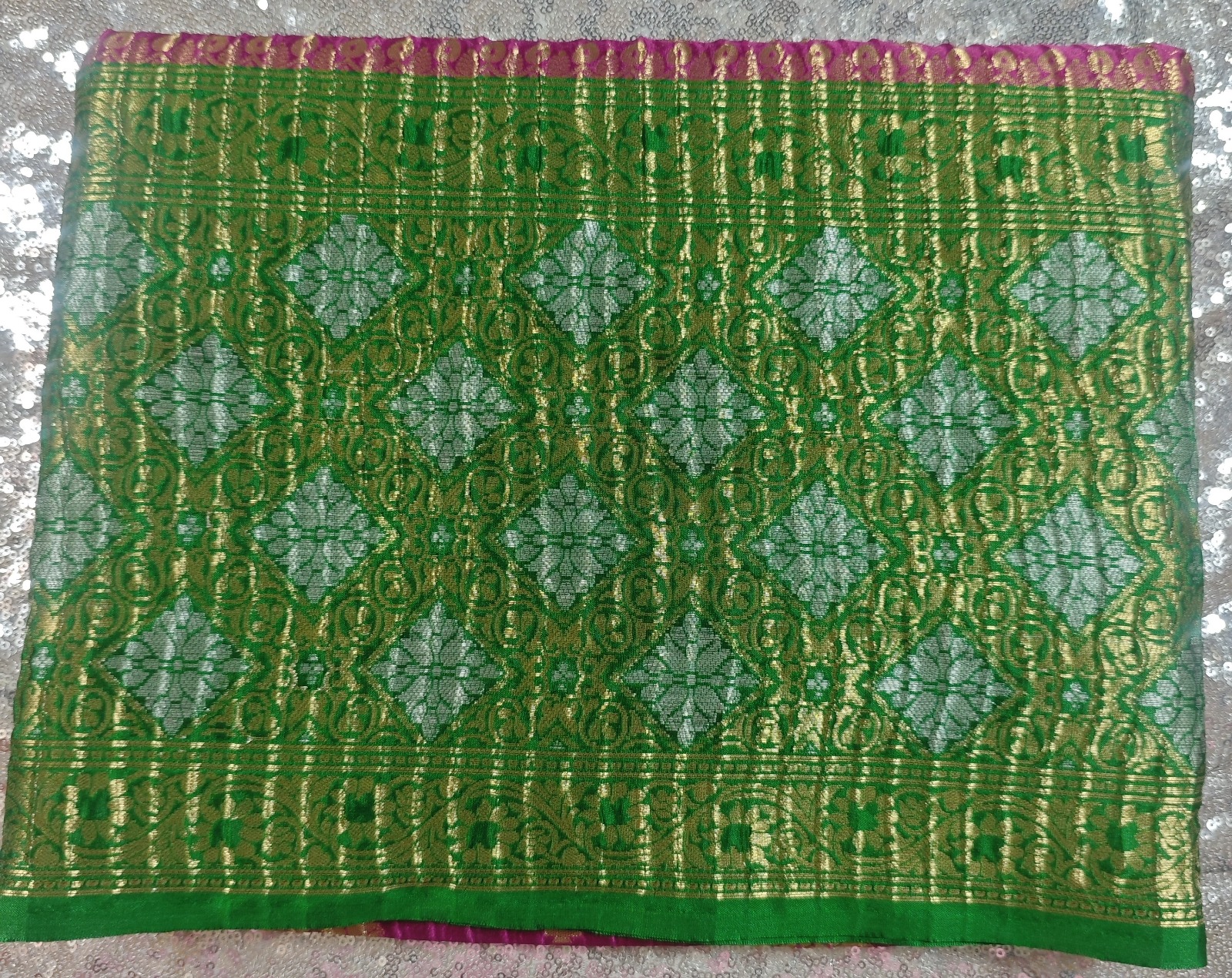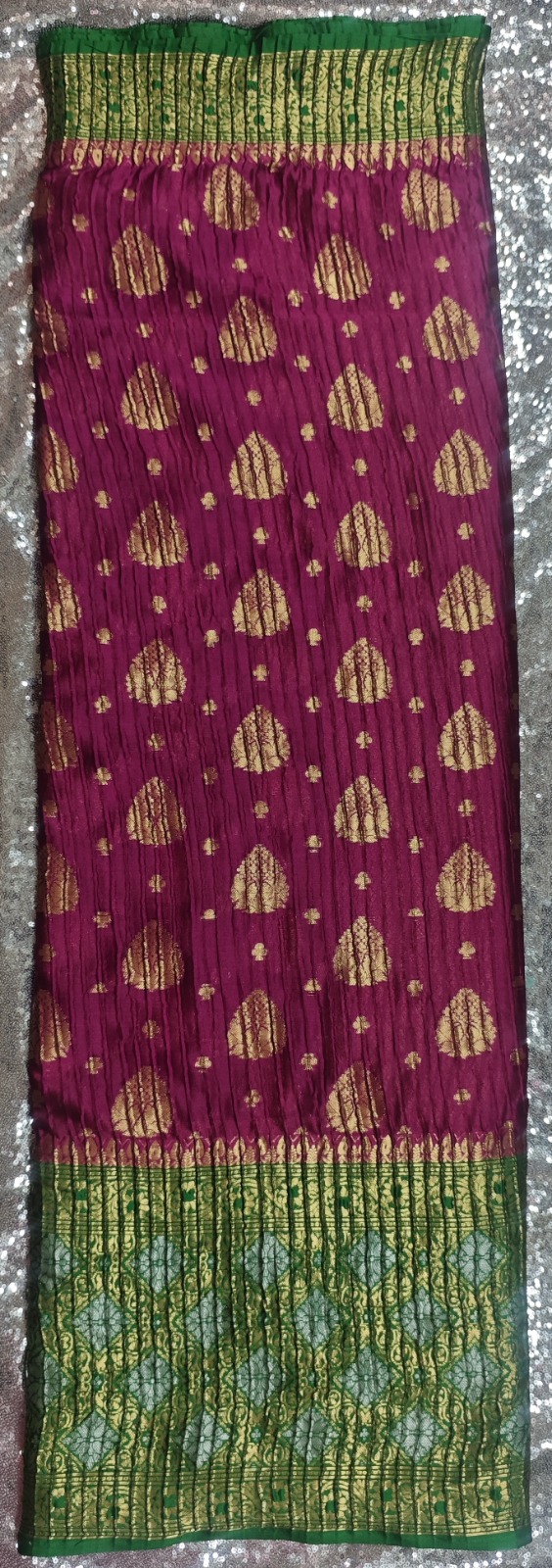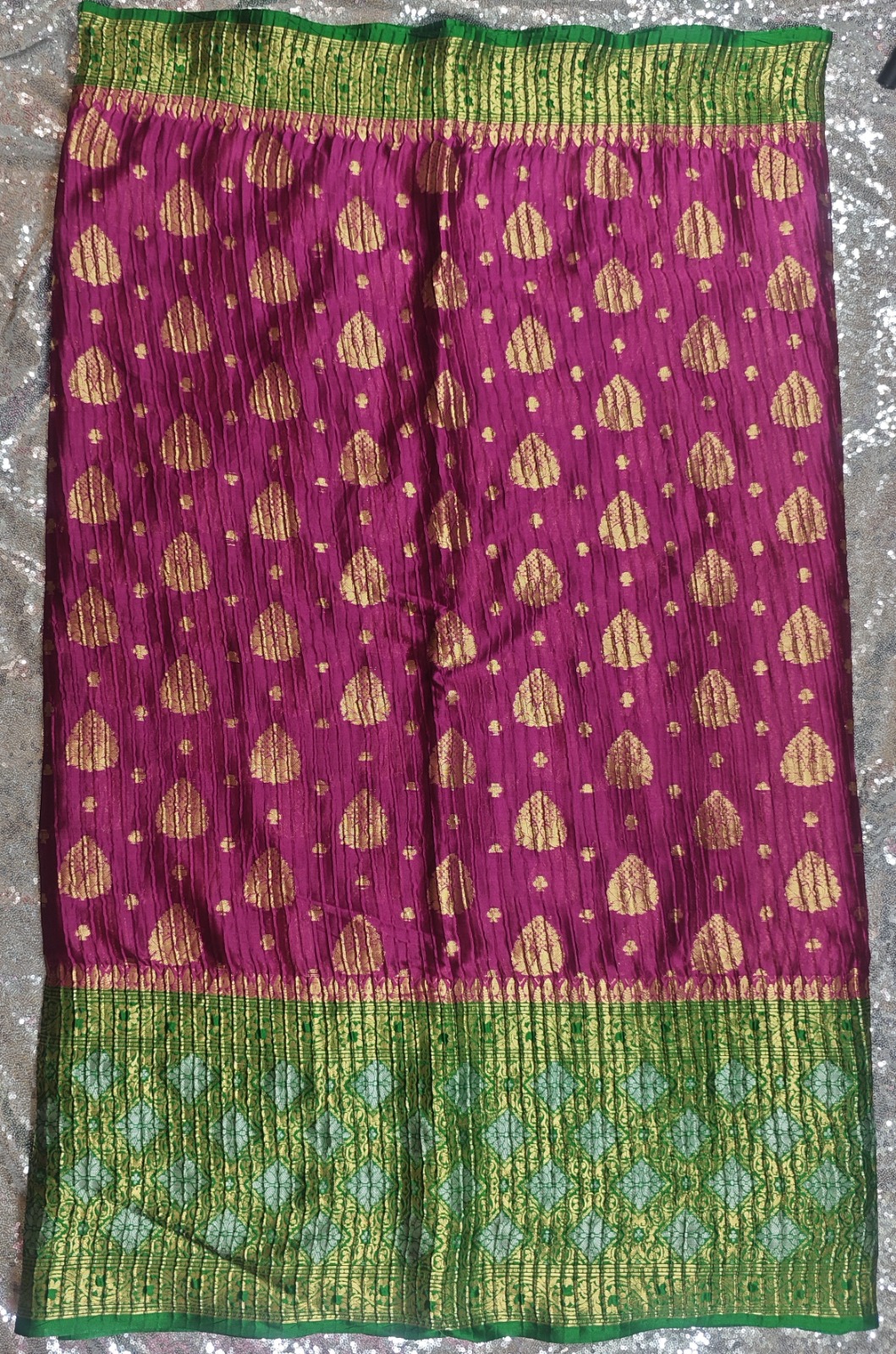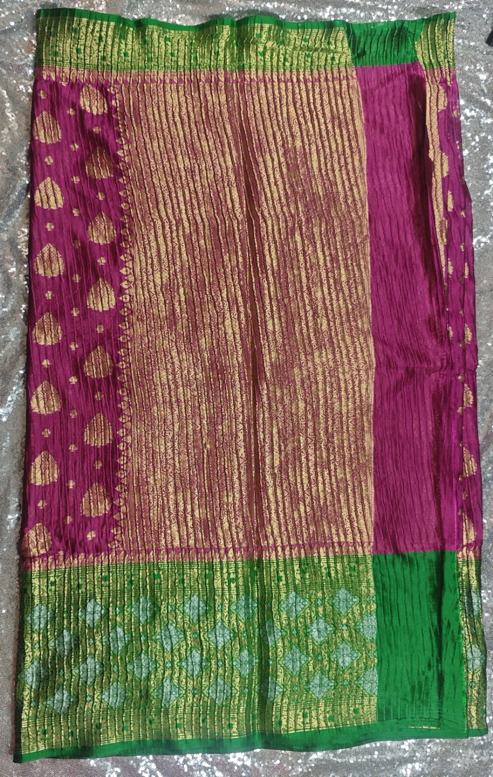 Katan Ikkat Magenta Banarasi Crushed Saree with Green Border – A Timeless Statement