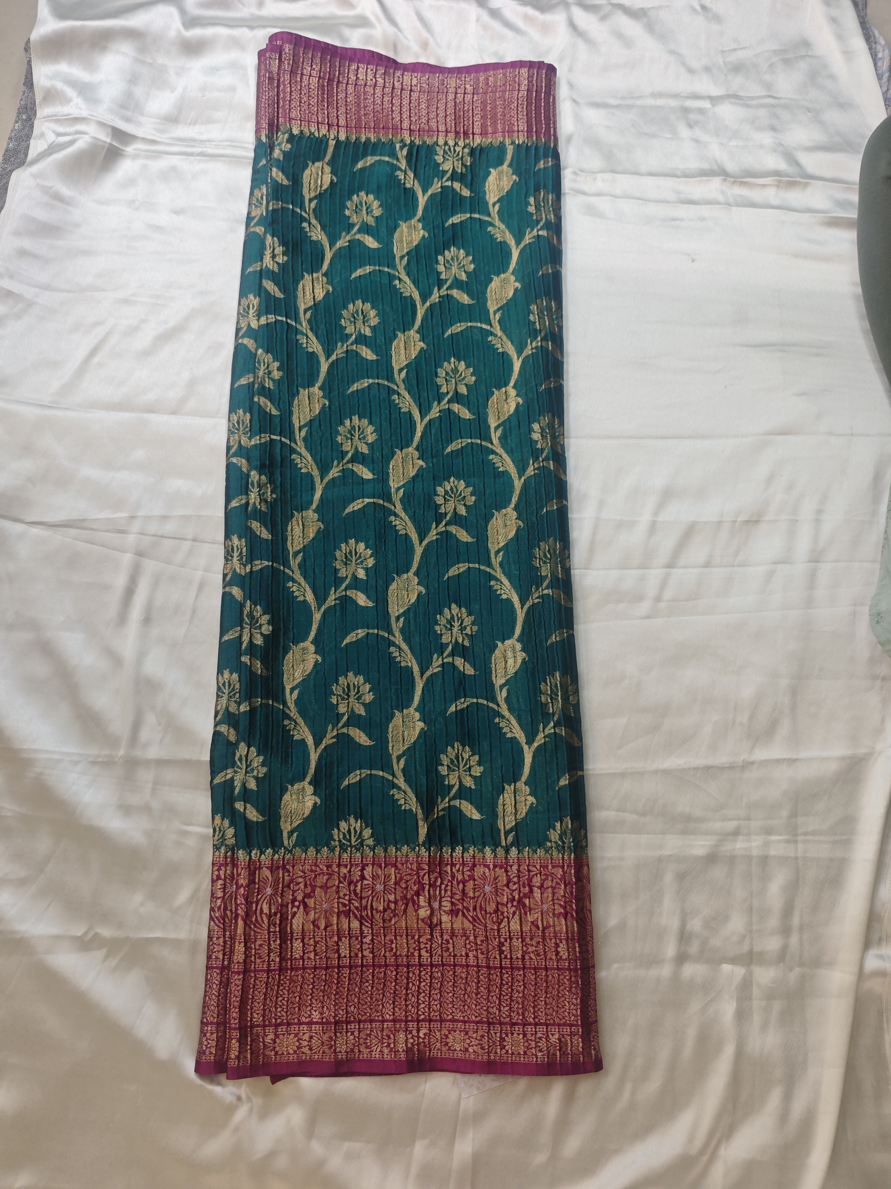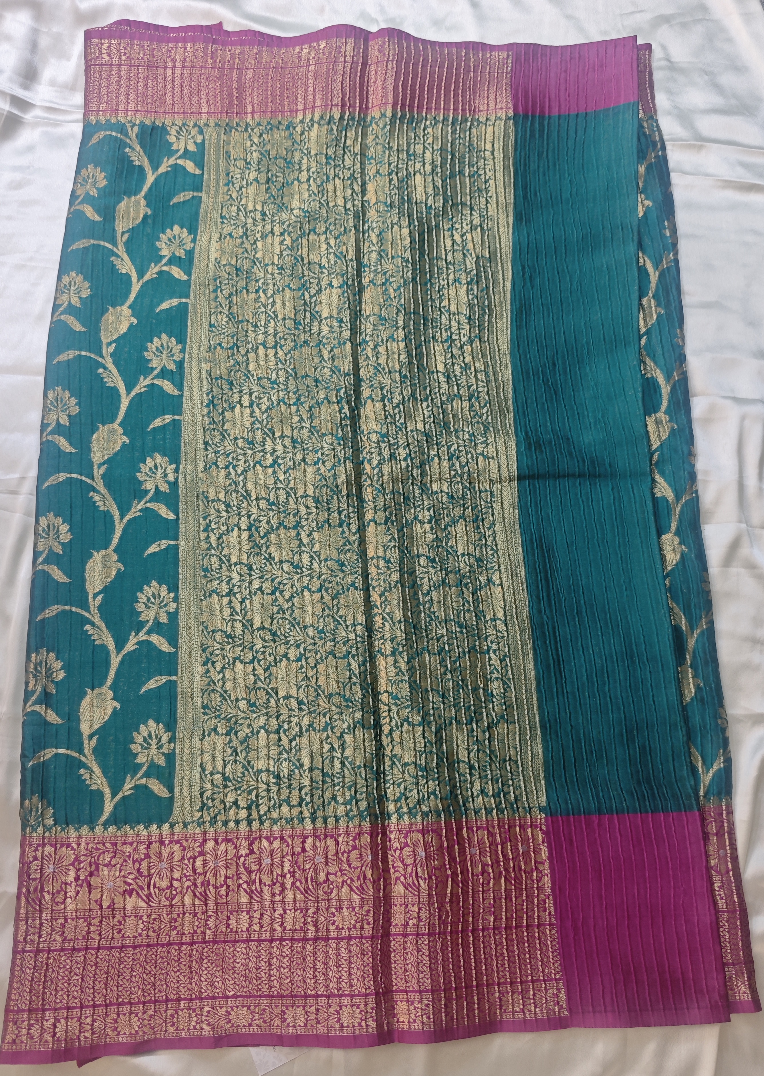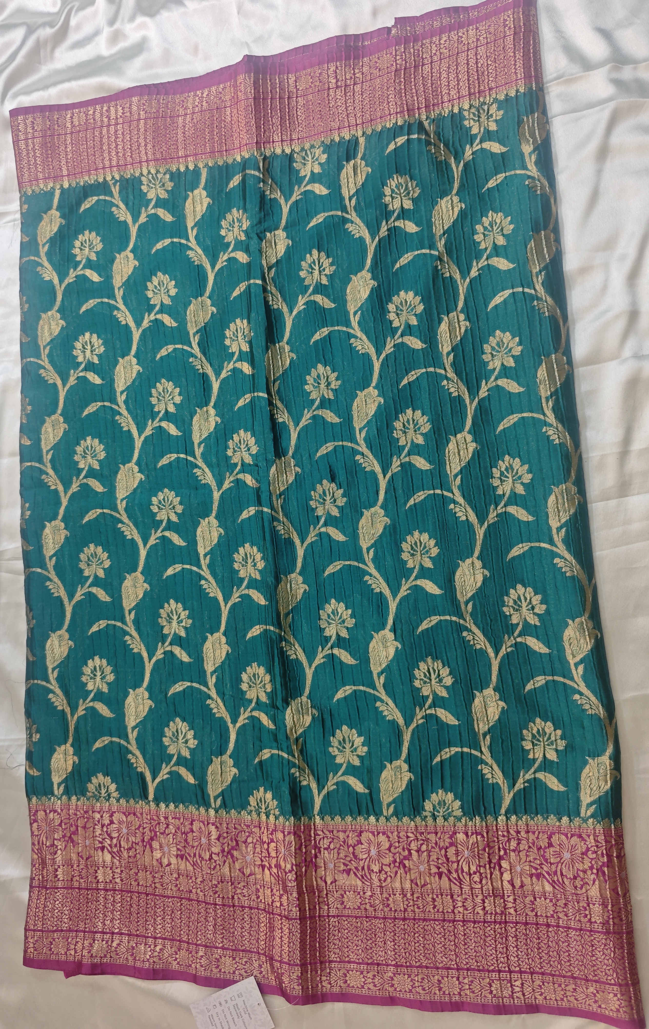 Katan Silk Banarasi Crushed Saree – Teal with Pink Border