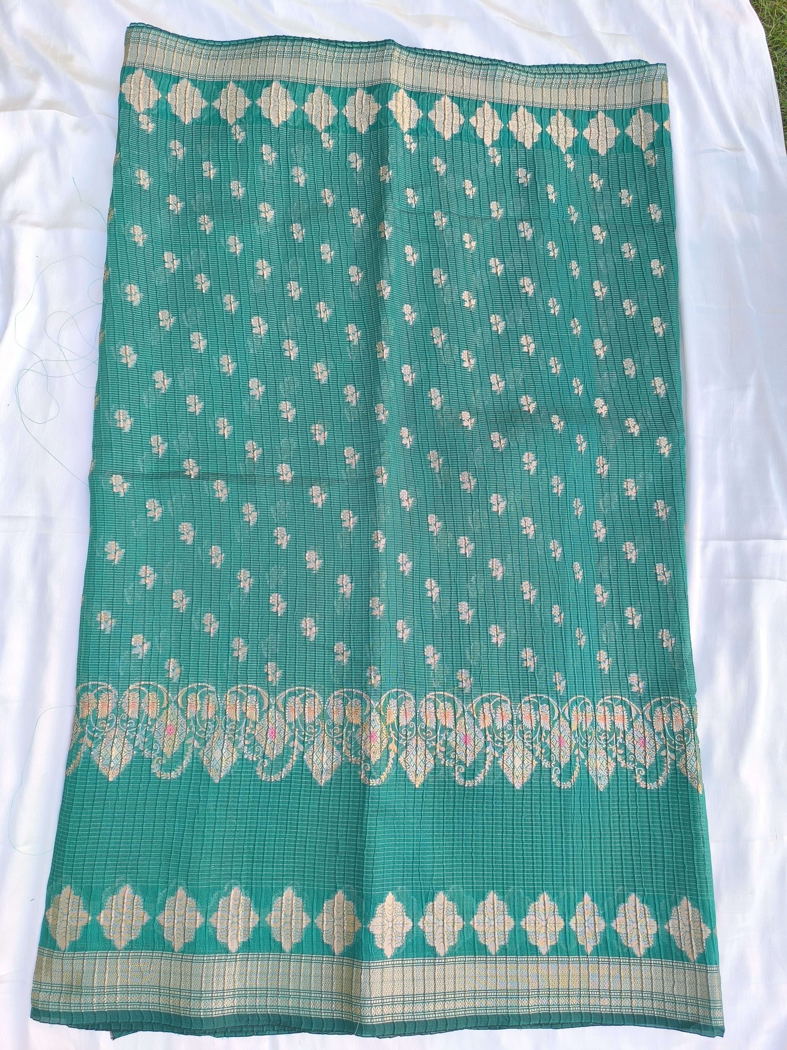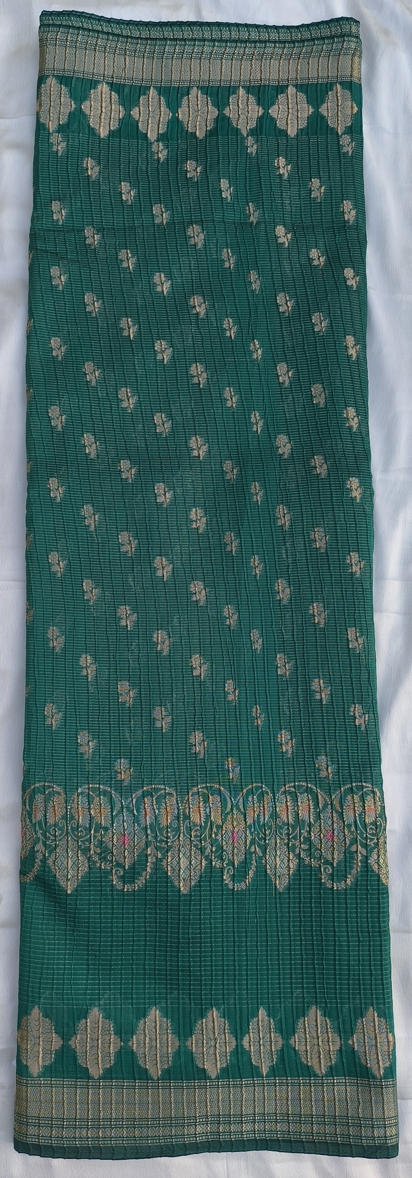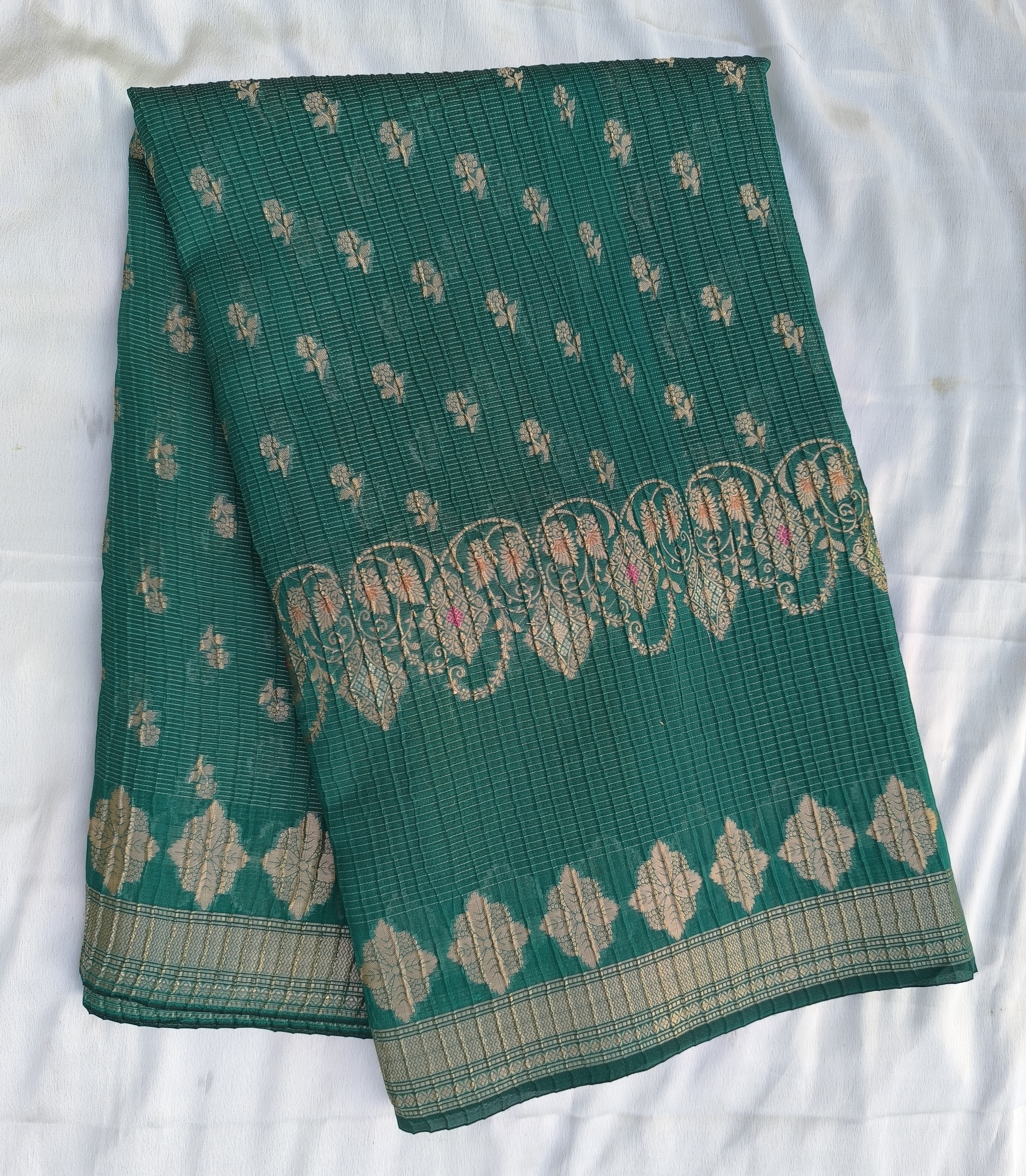 Step into timeless elegance with the Katan Zari Lines Green Banarasi Crushed Saree—a blend of tradition, luxury, and effortless grace! ?