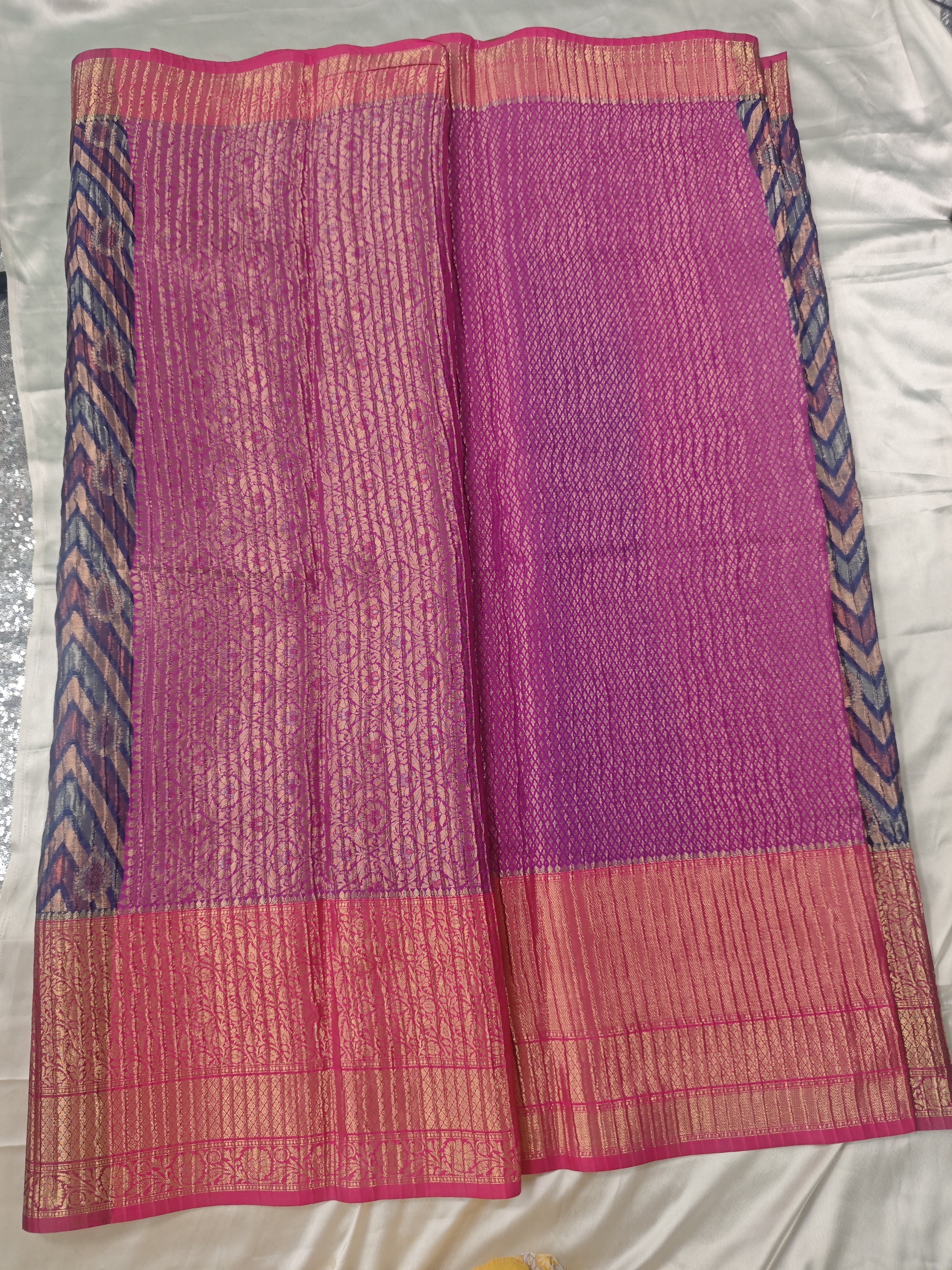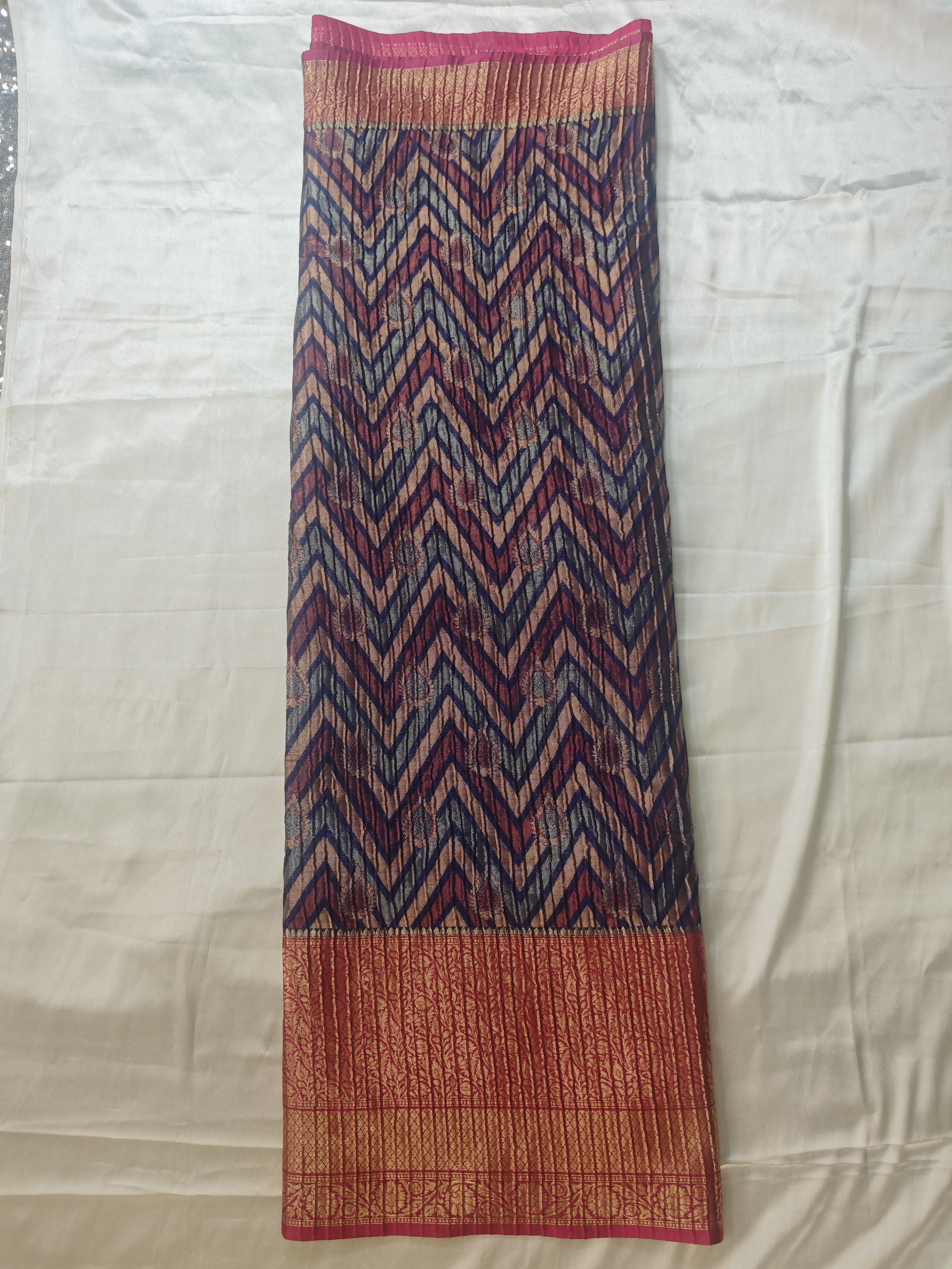 A breathtaking blend of tradition and elegance, the Tilfi Ranakaat Banarasi Crushed Saree is a masterpiece of handwoven craftsmanship. This stunning saree features a waved blue body, symbolizing grace and sophistication, beautifully accented by a vibrant pink border for a striking contrast.