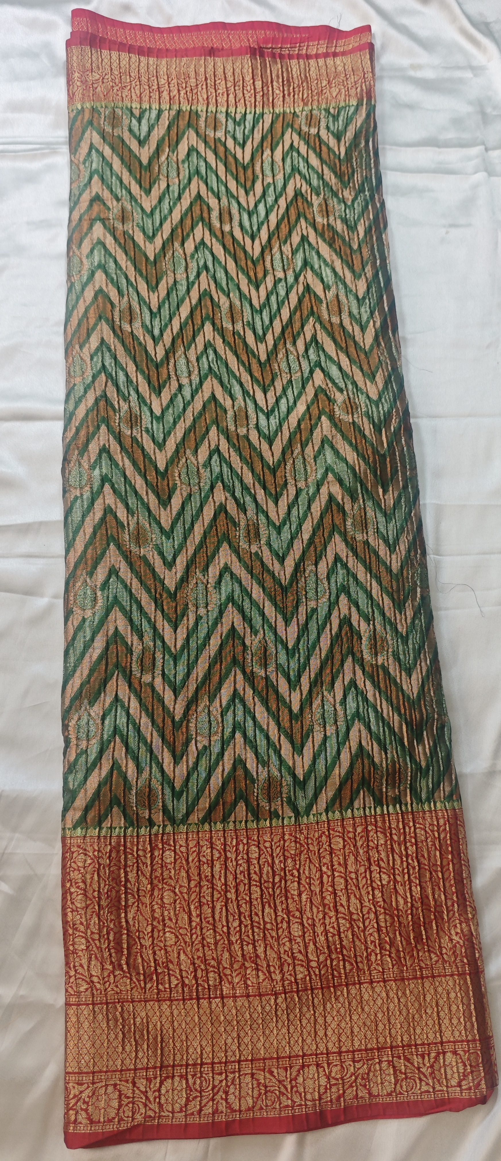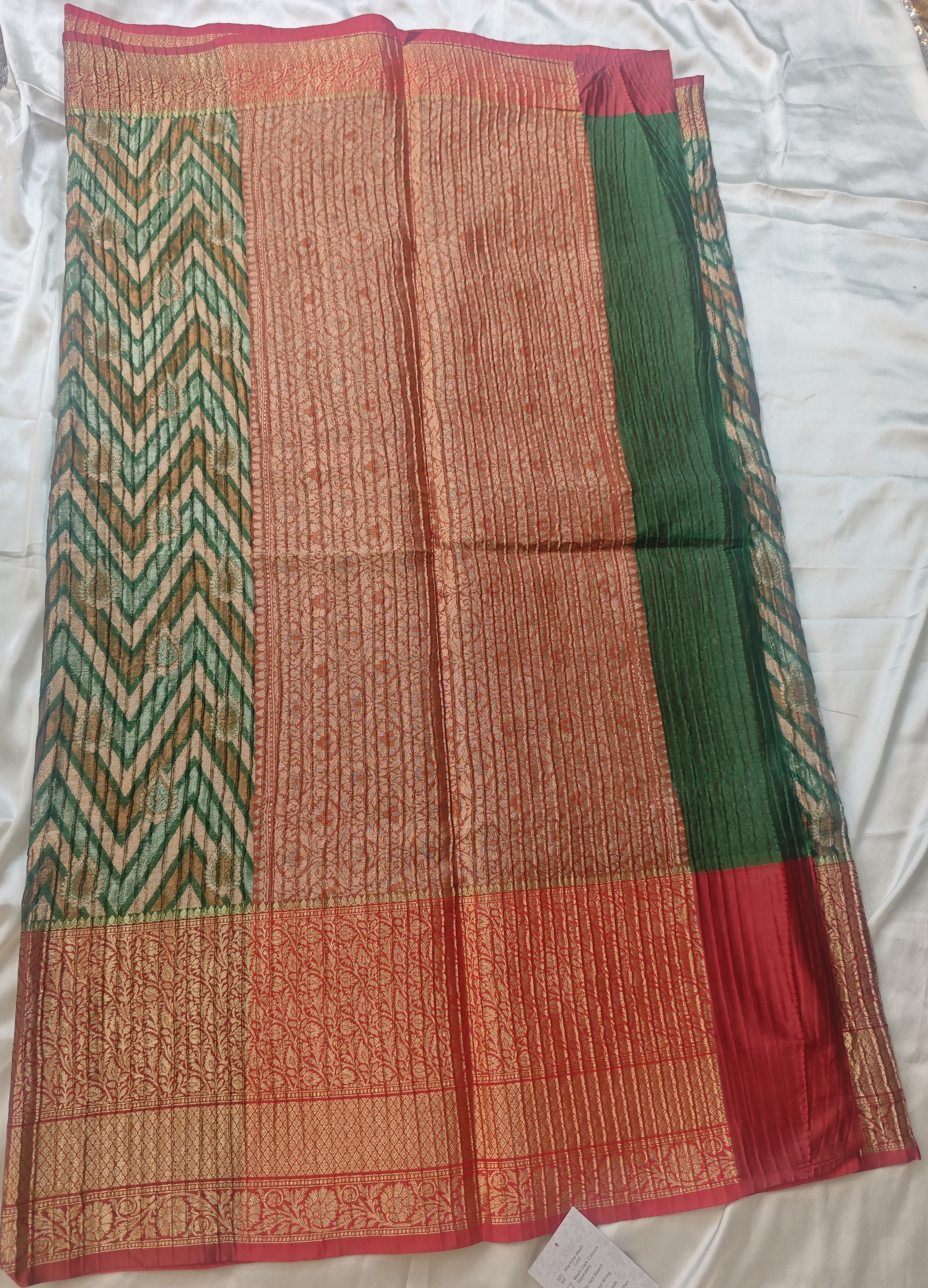 Tilfi Ranakaat Banarasi Crushed Saree – Green with Red Border