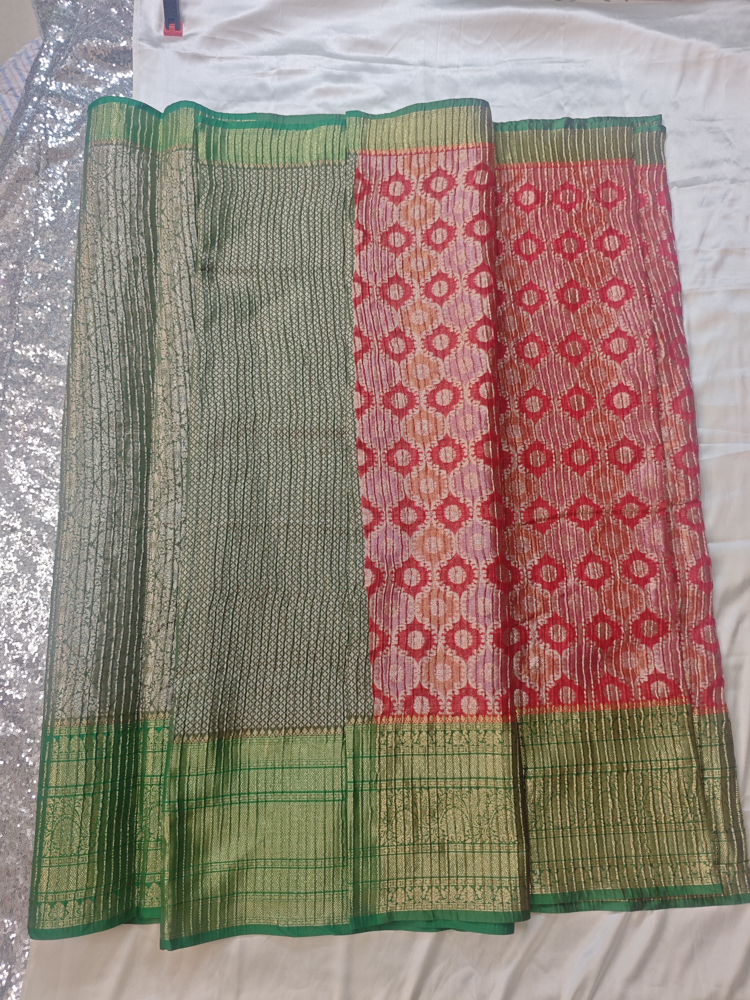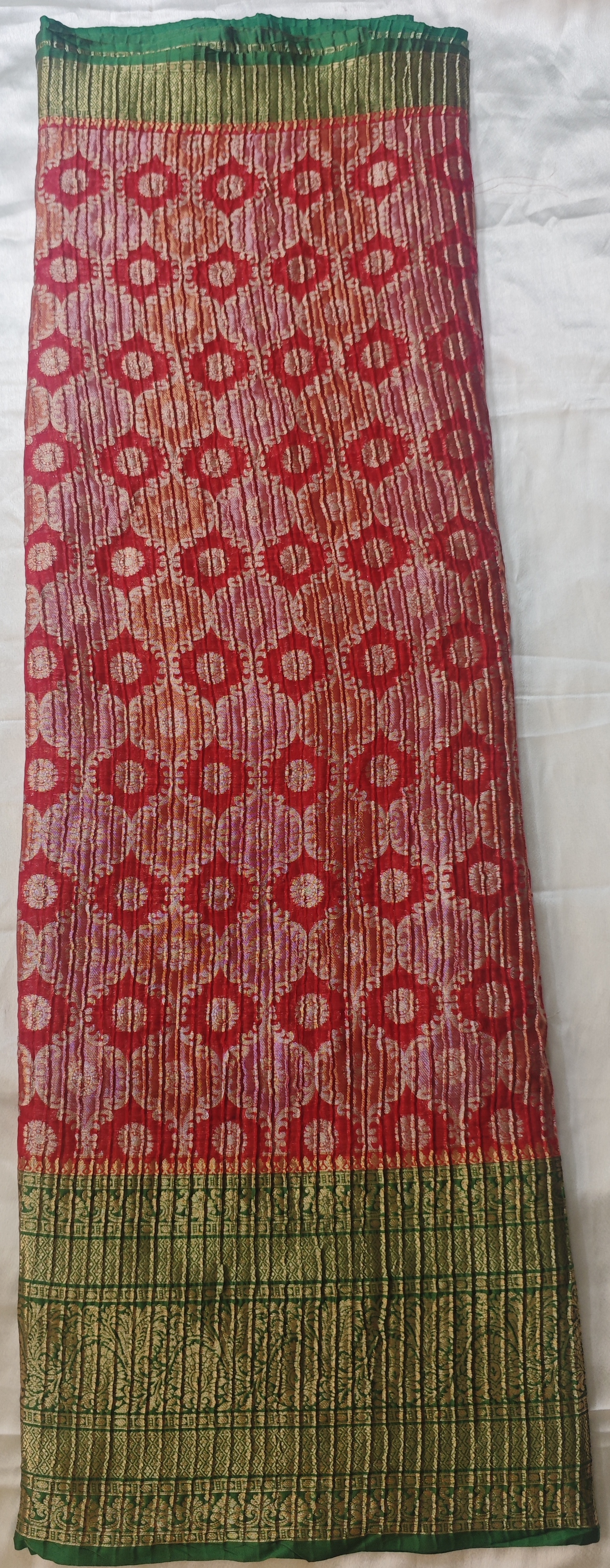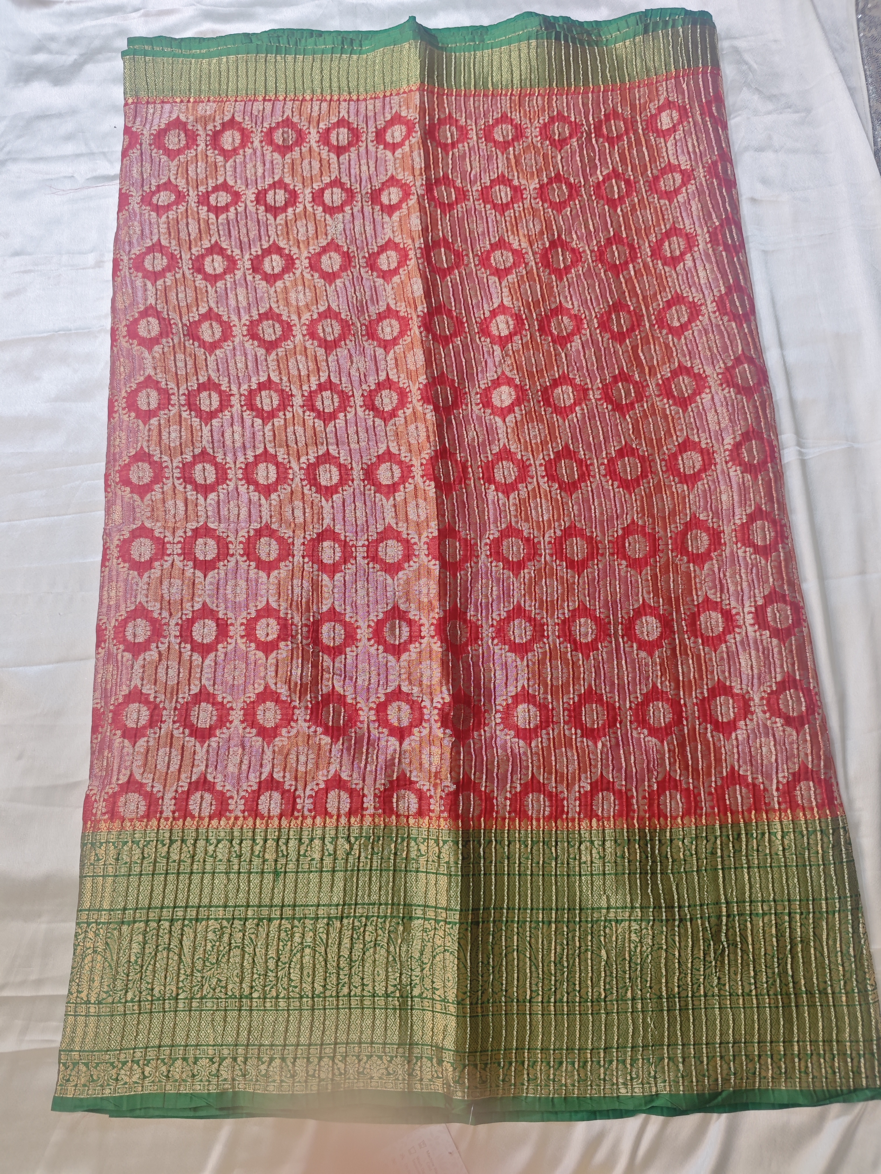Tilfi Ranakaat Banarasi Crushed Saree – Red Multi-Colour with Green Border